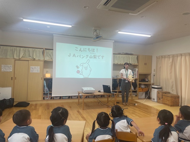 JA山梨みらいと共同し、学校法人数野学園しらゆり幼稚園(甲府市)の園児19名とその保護者を対象に、食農教育と金融教育の授業を実施しました。授業ではJAみらいを講師として「山梨県の特産物と地産地消」についてクイズを交えて講義をしました。また「おかねの教室」と題して金融教育授業をJA山梨信連が講義を行いました。